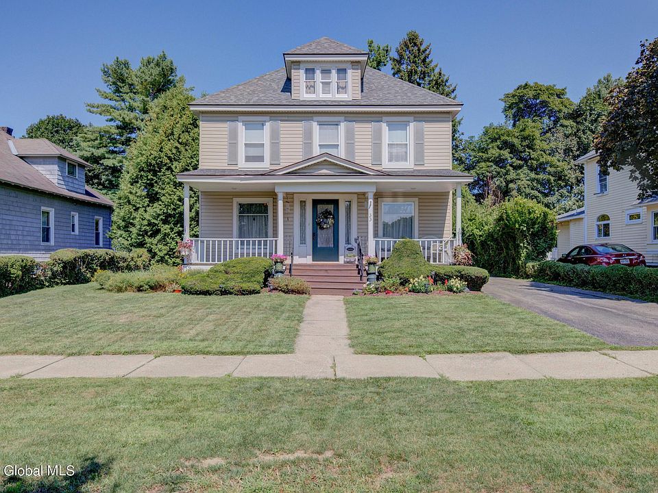 Abundantly charming and lovingly maintained colonial with beautiful view of Melchoir Park. Beautifully kept original woodwork, solid wood doors, hardwood floors and leaded glass windows. Large living room w/fireplace. Formal dining room. Eat in kitchen w/corian counters. Three bedrooms and a full bath upstairs plus walk up attic for storage. Two car garage, deck and above ground pool w/new liner last year. Newer natural gas furnace. Water heater is 2-3 yrs old. So much to love about this home!
