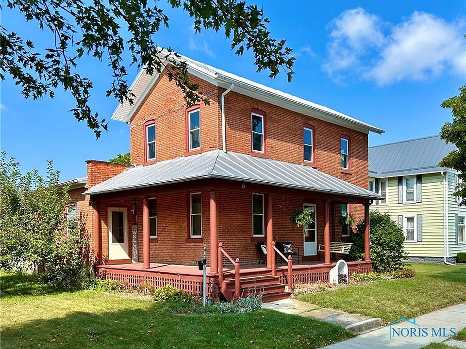 In the heart of New Riegel close to the park sits this lovely maintained historic 4-bdrm brick home. Relax on the wrap around front porch. Featuring a kitchen & dining room combo that allows enough space for welcoming large gatherings. Charming solid wood doors with timeless doorknobs bring character throughout. Replacement windows wrapped 15 years ago. The furnace is only 2 years old. The 2 car garage can house 2 vehicles & lawnmower comfortably. Refrigerator & work benches stay. It has a walk-up attic space for additional storage. Bascom Communications Internet is available.