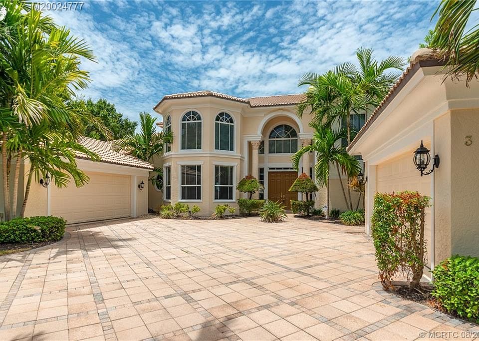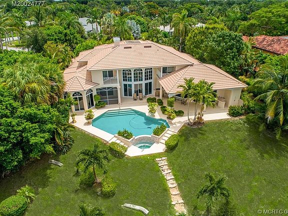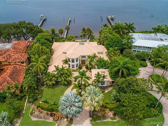 Situated in the sought-after & prestigious Town of Sewall's Point, this home offers privacy, tranquility, & stunning evening sunsets. This Spanish style CBS home w/impact glass sits on over 2/3 acre w/27 elevation securing 156' of wide water on the St Lucie River w/200' deep water dock. Offering almost 4700 sf under air, the towering ceilings, intricate woodwork, & expansive columns, exhibit impeccable architectural design. This home boasts a huge kitchen w/island, wood cabinets, butlers pantry, SS appliances, & granite. The vast ground floor master features sweeping views & 2 walk-in closets. The large master bath offers separate vanities, water closets, & whirlpool tub. The 2nd downstairs bedroom is perfect for a mother-in-law suite w/private bath. The 2 upstairs bedrooms w/private baths & patios are separated by a sitting area, all overlooking the sparkling river view. The lush landscape, tropical breezes, infinity edge pool, & waterfall into bubbling spa create the perfect oasis.