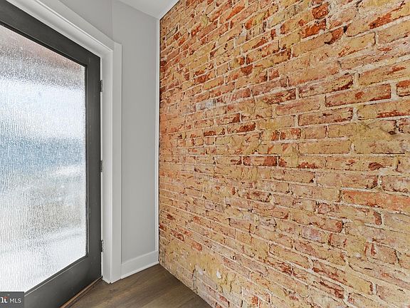 Exposed brick accent wallsOpen-concept kitchenSleek appliancesPlenty of prep spaceLarge gourmet style islandQuartz countertopsHardwood floors throughout