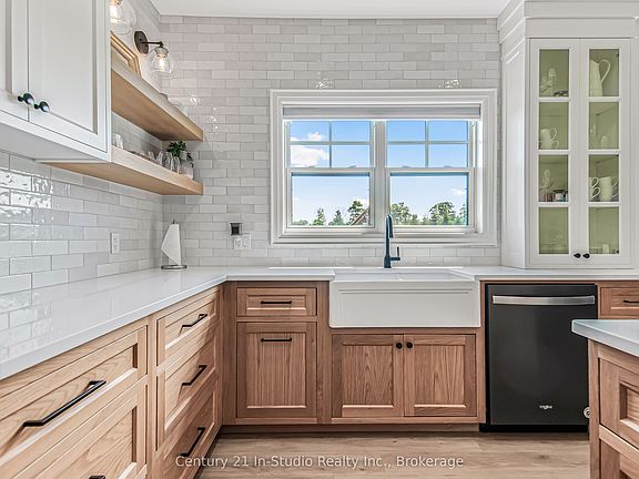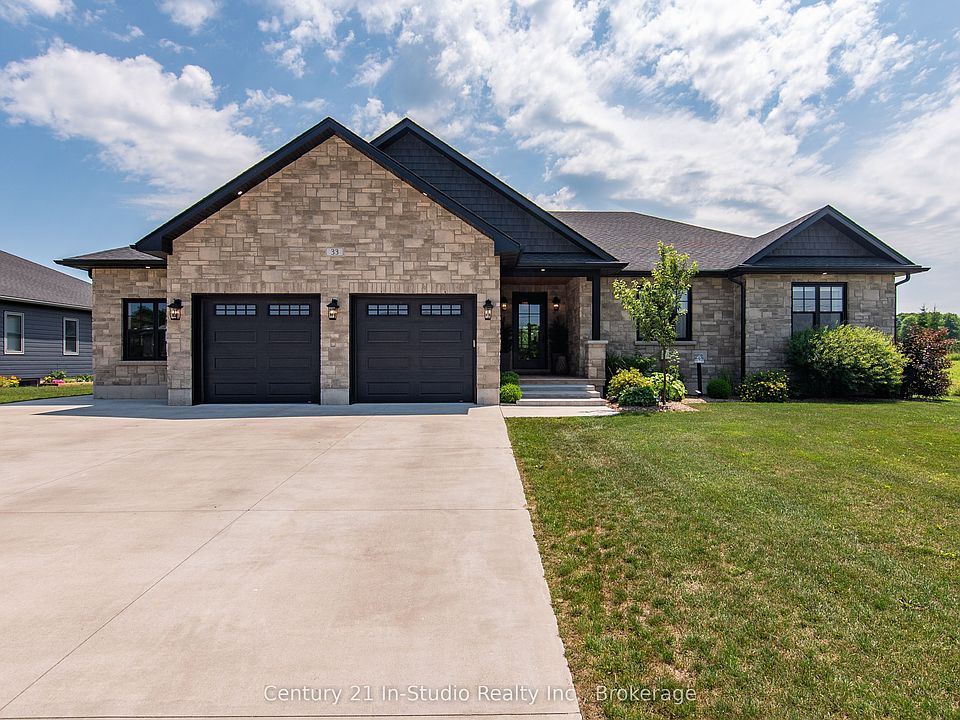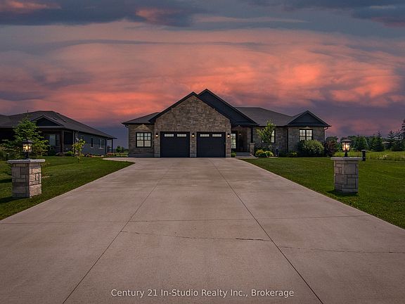 Custom-built by Murphy Construction, this home captures the look and feel of the designer spaces you scroll past on your favourite home inspiration accounts only this time, it's real. Located in Allenfords' premier Nickason Drive subdivision, this bungalow offers luxury finishes, functional design, and a fully finished lower level that checks every box. Curb appeal stuns with a full Shouldice stone exterior, stamped concrete front porch, triple-wide concrete drive, bold entry door, and oversized 2.5-car garage. Just 10 mins to Tara Elementary, 20 to Owen Sound, and 40 to Bruce Power, this is peaceful country living with commuter convenience. Inside, the main floor blends open-concept living with private retreat. The kitchen features crisp white uppers, rich white oak lowers, quartz counters, a brick-style backsplash, black stainless appliances, and a deep apron sink under a double window. A walk-in butlers pantry adds storage and prep space, with a 2-piece bath conveniently located just off the kitchen.The living room centers around a propane fireplace with stone surround, wood mantel, and custom built-ins. A wall of glass opens to the covered patio, flooding the space with natural light. The primary suite offers a walk-in closet, spa-like ensuite, and nearby access to the main floor laundry. Two additional bedrooms share a stylish 4-piece bath. Downstairs doesn't feel like a basement with 9' ceilings, in-floor heat, and a rec room featuring a custom media wall and wooden ceiling accent. There's room for your golf sim and home gym for year-round recreation, plus a fourth bedroom, kids play zone, office/guest room, and a designer 3-piece bath with tiled shower.Out back: a 16' x 8' covered patio, gazebo-covered hot tub, and fenced yard backing onto open space ideal for quiet mornings, outdoor dining, or evening relaxation.