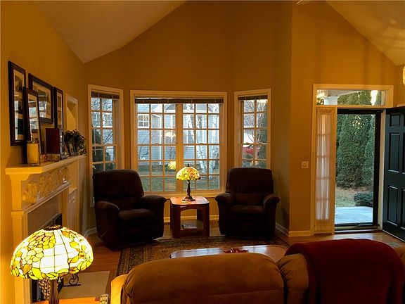 Rare 2 bedroom ranch style unit with Master Bedroom on first floor. Living/dining area with lovely built-in entertainment unit, gas fireplace with exquisite mill work and elegant metal grill work, deep dry bar with glass shelving, and large bay window. Master bedroom has great walk in closet and a lovely built in corner cabinet entertainment center. Kitchen has space for eat in table and hard wood maple cabinets like new. Second bedroom has extra storage built-ins and based on location can be a separate dining room. Hard wood floors flow through out the entire first level. Freshly carpeted lower level (including stairs), perfect for office space or family room or second bedroom. The lower level has a utilities room and extensive extra storage rooms off the mud room like entry from the garage. Lovely landscaping and blue stone entry patio. Meticulously maintained. This upscale Nantucket modeled complex, with its shingled siding and stone walls, has a clubhouse, pool and tennis courts. Detailed landscaping and charming cul-de-sacs.