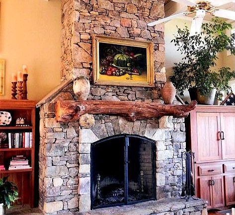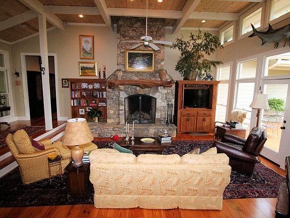 Smak Dab - Custom home w/ a Smak Dab rockface view of Laurel Knob- absolutely stunning- this home was designed & built by Sweetwater Builders offers reclaimed 10/12 wide heart pine flooring & cabinets, massive native stone fireplace extends to the peak of the vaulted post & beam ceiling, open living concept from the custom kitchen to dining to entertaining indoors & out this floorplan was thoughtfully designed; master suite with fireplace, heart pine floors the perfect setting to enjoy the view