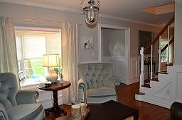 Charming Colonial/Cape with mu Renovated in 2007, nestled on 1/2+ acre landscaped country setting, with stone walls and lawn sprinklers.features FamRm addition off newer kitchen w/gas fireplace, and sliders to deck. 2 zone central air and gas heat. 8Rms,3Brs, 2.5 baths, hardwood floors, crown molding accenting. finished basement.