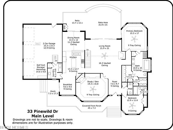 Beautiful custom home that has been meticulously maintained. You will be greeted with magnificent windows and views of nature.The wrap around front porch encourages one to relax and watch golfers of 6th tee of Azalea Course. 33 Pinewild Dr is perched elegantly with privacy and gardens with plants in bloom nearly all year long. Patios in rear have attractive stonework and an awning. Home features main level living with 910 square feet of completed basement. Basement has flexible space for media, crafts, or office.
