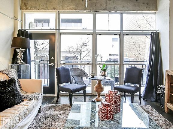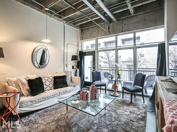 Welcome to 33 Ponce! This building is a hidden secret featuring chic modern styling in this open loft. The dramatic high ceilings and the wall of floor to ceiling windows opens to the large covered walk-out balcony overlooking the Fox Theatre. The sleek black granite and stainless steel kitchen is designed as a perfect setting for serving your guests while creating an abundance of space. Wide plank hardwood floors continue into the oversized bedroom with its custom closets. The bath features a soaking tub and a separate shower.Secured parking w/assigned space, and Private Storage Locker. HOA includes cable, internet, gas, water and sewer. This boutique Midtown community is adjacent to the Fox Theatre and the North Avenue Marta Rail.