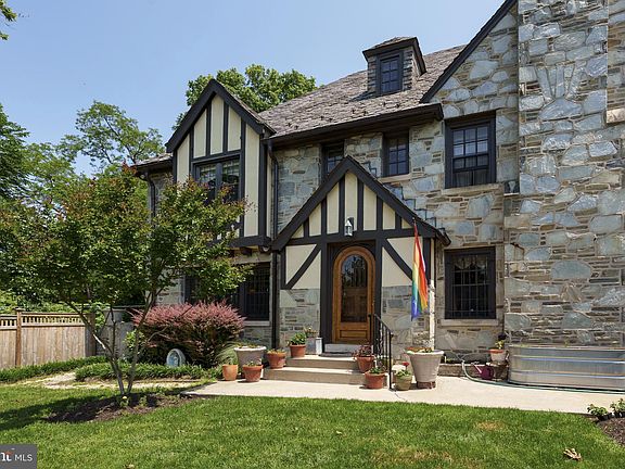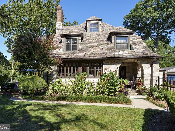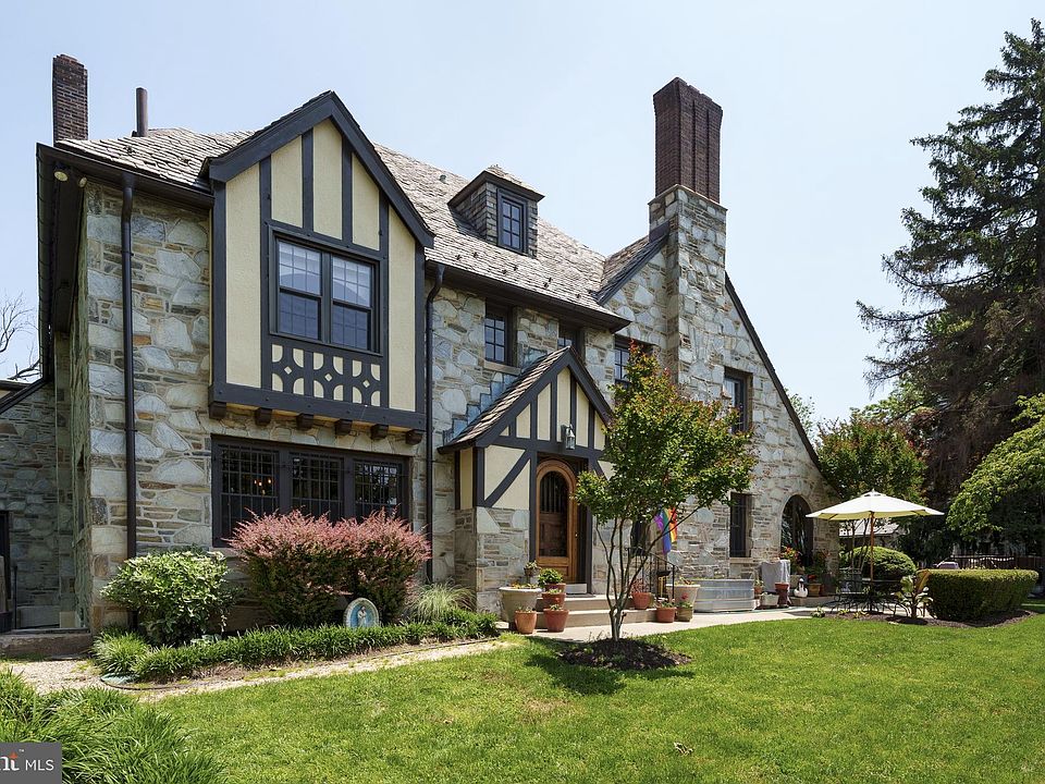 This Tudor Revival stone house with a stately slate roof crown exudes a timeless character. Original Mercer Tile bathrooms, American Chestnut woodwork, and distinctive light fixtures are charms worth noting. Curved archways and generous formal spaces are features of the main level, where authentic materials and craftsmanship are on full display. The kitchen channels a retro vibe with stainless steel counters while the dining room, framed by rich woodwork and river views, is ready for gatherings both formal and informal. A front-to-back living room with a fireplace opens to both a sun porch and a sunroom, with serene vistas of the Delaware River. Upstairs, the bedrooms provide flexibility and privacy. The primary features a door to a bathroom shared with the hall, while two bedrooms share a Jack and Jill arrangement, and there’s a study/fourth bedroom. The third floor adds two more guest rooms and an additional bath. A separate suite above the two-car garage with a bathroom is perfect for a home office or creative pursuits. The walk-out finished basement expands the living space with a second fireplace, half bath, and direct access to the outdoors. Upgrades include a rehabilitated roof, conversion to gas heat, a newer furnace and water heater, and the addition of an elevator connecting the basement to the first and second floors. Outside, the fenced grounds are lush and inviting, with blooming gardens and intimate courtyard-style spaces.