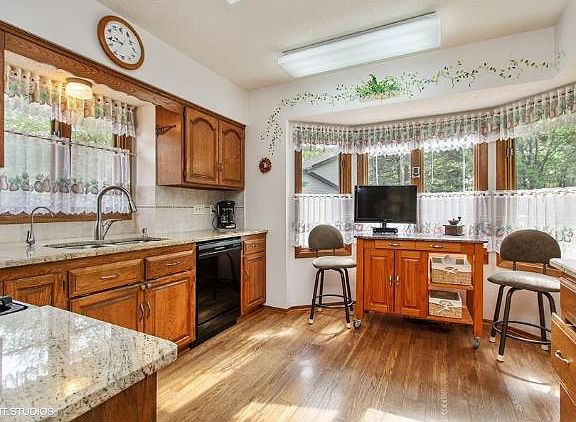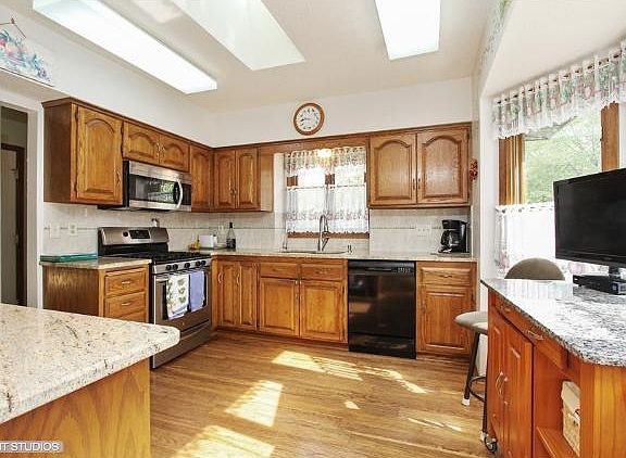 Enjoy this woodsy & beautifully landscaped lot from the 4 season porch & 2 level deck. Split level with formal Living Rm upstairs & Family Rm w/ brick fireplace down. Sunny kitchen with granite, oak cabinets, island. Bright laundry with new washer/dryer.