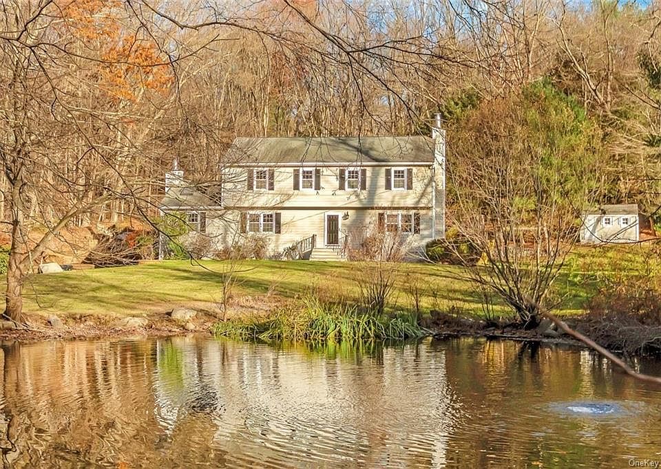 Tastefully renovated Colonial in the storybook hamlet of Scotts Corners in Pound Ridge. Boasting a serene lot, with a stone bridge crossing over private stream and front yard pond. Inviting foyer leads to a large, formal sitting room with fireplace. First floor continues to the formal dining room, eat in kitchen with brand new cabinets, stainless steal appliances, granite countertops, and french doors to sprawling stone patio surrounded by mature landscaping. Enjoy a separate family room boasting vaulted ceilings, skylights, and second fireplace. Tasteful powder room and private laundry room. Refinished hardwood floors, fresh paint, and brand new light fixtures and recessed lighting throughout. Second level has spacious master bedroom with his and her closets and renovated ensuite full bath, 3 more bedrooms, and full hall bath. 1 mile to Scotts Corners boutiques featuring vintage treasures, chic home goods, and restaurants. 10 minute drive to New Canaan Metro-North and Merritt Parkway.