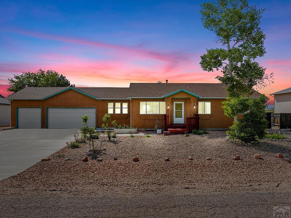 Expansive ranch-style home near Desert Hawk Golf Course in Pueblo West. Sited on a 0.36-acre lot that backs up to an expansive greenbelt (no rear neighbors) Which includes a trail for walking, biking, & horse riding! This home offers an abundance of generously sized rooms and convenient design features that make it perfect for you! Elevated vaulted ceilings highlight the living room, with gorgeous flooring, neutral paint colors, with brilliant pops of color. The large updated kitchen has beautiful quartz counter tops, stainless steel appliances, ample cabinet space, along with formal & breakfast dining. Huge extended primary bedroom includes a 4-piece bathroom with dual sinks, walk in closet, & secondary closet offering a luxurious retreat. Main bath is stunning with step-in shower for accessibility. Full basement has a newer modern bath & is ready for all of your future expansion plans. Perfect for a family room, game room, exercise area, & additional bedrooms. Delightful outdoor space with the open rear patio and immaculately landscaped front & rear yards with rose bushes, wild flowers, green grape vine, apple trees, lush green grass, garden beds, large shed, chicken coop, kids play area with swing set, and trampoline all encased by a 6ft wood privacy fence. It even has a 3-car attached garage & RV/boat parking, ensuring ample space for your vehicles. Don't miss the opportunity to make this exceptional property yours. This home is ready for you to simply move in & enjoy!