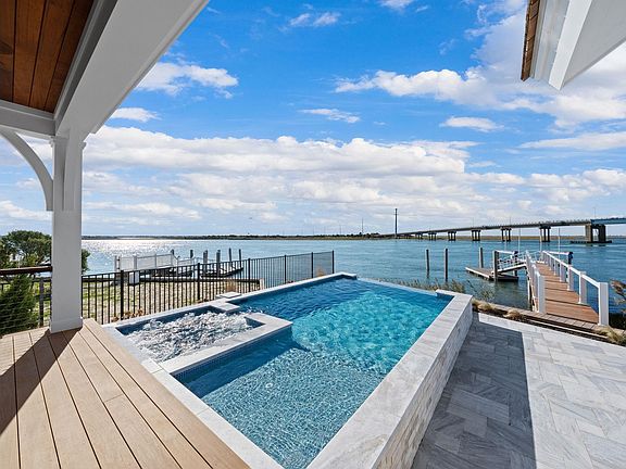 Welcome to 33 Seabreeze Lane, a premier Avalon Manor Bayfront estate custom-designed by Blaine Steinman and masterfully constructed by Brandywine Developers. This private maritime home, with its unrivaled panoramic perspective, provides the rare combination of both sunrise and sunset views. In addition to the 6 bedrooms and 7+ baths, this home boasts 10 ft ceilings and 8 ft doors, approvals for which prove challenging on 7 Mile Island, distinguishing this property from those while being offered at a fraction of the price. A water view from nearly every window truly invites the outside in, and renders this house an incomparable nautical haven that epitomizes waterfront living. Unlike the typical upside-down shore home, the light-filled first floor is ideal for entertaining as the kitchen, dining, and living areas extend seamlessly through oversized doors to both the pool area and expansive covered porch, which features lpe decking, retractable screens, and a state-of-the-art vented outdoor grill space. Travertine tile adorns the custom infinity-edge pool (with sun shelf) and hot tub to match the surrounding outdoor patio. Additional highlights of the first floor include a lofted garage, full master suite, mud room, laundry room, wet bar, and custom kitchen that includes a spacious center island, quartz countertops, Subzero and Wolf appliances, and a large farmhouse sink. The main staircase ascending from the two-story foyer accentuates the millwork, shiplap, and custom carpentry displayed throughout the home. The second floor master overlooks the waterway through large glass-panel sliding doors that open to a private balcony. The master bath, adjacent to a walk-in closet with custom wood organizers, features a tiled shower with glass door, rain and hand-held showerheads, and double sinks. The second floor also contains four additional bedrooms, each with its own full, private bath, one of which also opens to a private balcony through glass sliders. An additional laundry room with a utility sink, custom cabinetry, and quartz countertops completes the second floor, contributing to the home's exceptional livability. A distinctive room on the third floor spans the length of the home and produces breathtaking views, further emphasizing the beauty of this special location. This room also has its own full bath, another private deck, and additional storage. Endless possibilities abound as this space could easily be converted into a game room, home gym, theater, or third floor master suite. The dock area - a stone's throw from the gas pumps at Avalon Marine Center - is a boater's dream featuring exceptional depth (15 ft at low tide), floating docks, a heavy duty boat lift, and unimpeded access to Townsend's Inlet making ocean voyages an easy option. Southern (SW) exposure shields the docks, water-facing rear of the home, and property from unforgiving Nor'easters. A massive outdoor shower steps from the bulkhead provides a refreshing retreat after a day on the water or a swim in the bay. This home features considerable upgrades including a second staircase, indoor/outdoor Sonos sound system, cedar shake roof and siding, high-efficiency Andersen A-series DP-50 windows and sliders, engineered hardwood floors, gas lanterns and custom lighting, exposed aggregate driveway, and a cozy gas fireplace with a reclaimed barn-beam mantel. This Bayfront hideaway conveys waterfront living at its finest, and bestows the ultimate destination for those who enjoy a sunset cocktail or a saltwater thrill. If you seek exceptional craftsmanship, style and comfort, and wish to create lasting memories while fishing, boating, swimming, or floating, then look no further than 33 Seabreeze Lane in Avalon Manor.