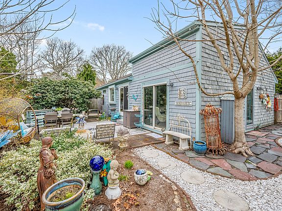 Upon entering, you will be greeted by an inviting open layout. The living/dining room with wood floors, sunny bow window and fireplace with custom detail, all creating a warm and welcoming ambiance. The updated kitchen is complete with gas range, SS appliances, ample quartz counter space, and bar seating for casual dining. The great room with cathedral ceiling, skylights and outside access features a loft area, adding character and versatility to the living space. The primary bedroom offers a tranquil retreat, while the second bedroom provides space for guests or a home office. The remodeled bath showcases a walk-in shower and modern custom features. Step outside to discover the many outdoor spaces for enjoyment, including an attractive side yard, patio area, fire pit and raised beds for gardening. Additionally this property features an adorable beach bunk house, adding a touch of coastal charm and providing a unique space for hosting guests. A full basement, gas heat, two storage sheds, many new windows and doors and an outdoor shower! Come and explore the potential of this delightful property. Measurements are approx, buyer encourage to verify at property.