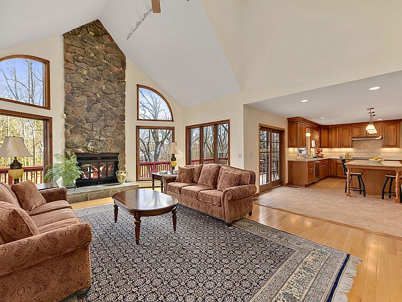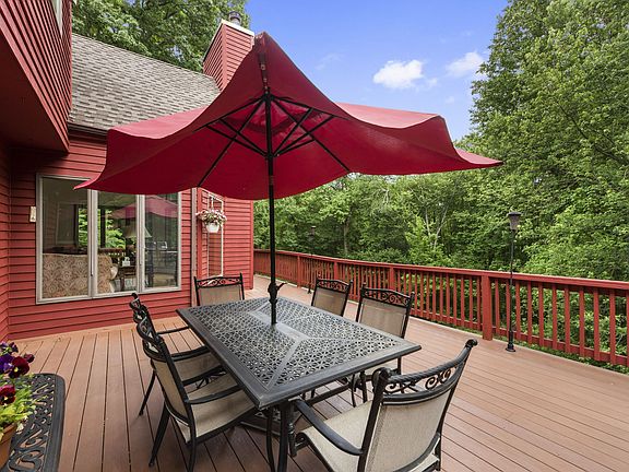 Set back from the tree-lined road with beautiful landscaping, a wrap-around deck, vaulted ceilings, skylights and floor-to-ceiling windows, this sunny, spacious home feels like a retreat. The highly-desired layout features an updated Chef's kitchen open to a family room with a stone fireplace, a separate formal dining room, formal living room and an additional room on the ground floor perfect for an office, den or guest room. Upstairs, the master bedroom has tray ceilings, over-sized sliding glass doors to a private deck with scenic views, walk-in closets and a master bathroom with marble counters and flooring. There are three additional bedrooms, a bathroom with double-sinks and a second back staircase going down to the ground floor laundry and mudroom. Professionally landscaped with a large, flat backyard and woodlands behind, this home offers privacy and tranquility.