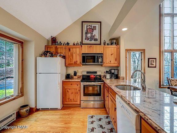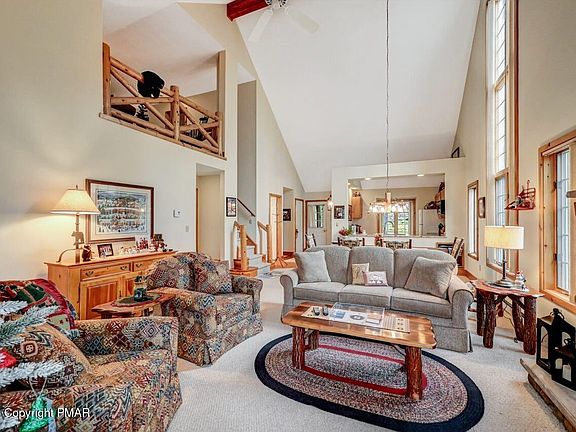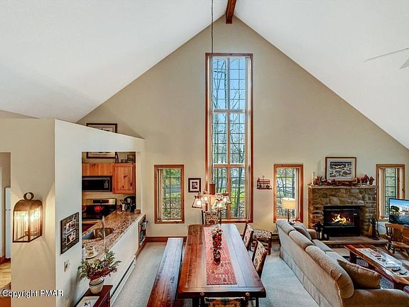 Adirondack-style ski home nestled in the heart of the Pocono Mountains. This fully furnished, charming retreat offers the perfect blend of rustic elegance and modern convenience, ready for you to enjoy immediately. Grand Cathedral Living Room with Open Concept, Floor to Ceiling Windows & Wood Burning FP. Granite Kitchen Counter tops, Laundry 1st Floor. Master Bedroom w Bath Suite and Guest Bedroom w adjoining bath on 1st floor. Screened covered porch. Upper level Bedroom 3 with adjoining 1/2 Bath & Sleep Loft.. Lovingly cared for and updated over the years. Perfect for Family ski getaways, Vacation rental investment or A year-round mountain escape.