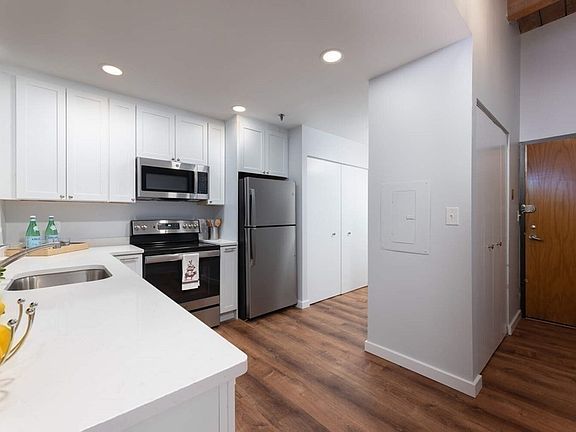 Dockside Place - Move right in to this stunning TOP FLOOR 845 sq ft brick and beam loft located in the heart of the Seaport with dramatic city skyline and water views. Brand new renovation- features include appx 12 ft ceiling height, beautiful kitchen with white cabinetry, quartz counters, SS appliances, a spa like bath & dressing room with classic black and white tile and new fixtures. An expansive floor plan with grand proportions allows for easy partitioning of a living/dining and separate sleeping areas. Painted throughout in soft fresh colors and accent walls, there is brand new flooring, new windows, new custom lighting fixtures, 5 generous closets and a full size in unit washer & dryer. Located in the one of the most popular neighborhoods in the city, convenient to a multitude of restaurants, shops, entertainment venues and green space, with easy access to major commuter routes ,T, South Station & airport. Nice option for a first time buyer, pied a terre or investor rental.