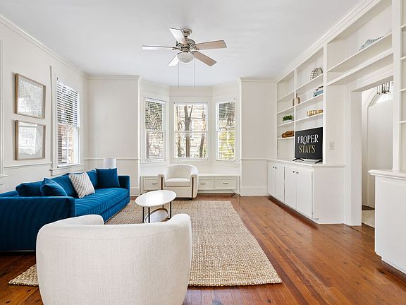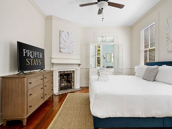 Step inside to find a bright and airy living room, where high ceilings and large windows fill the space with natural light. A cozy couch, two stylish chairs, and a window seat overlooking Society Street create an inviting space to relax, while the decorative fireplace adds a touch of classic Charleston elegance. A smart TV ensures you can unwind with your favorite shows after a day of exploring the city.