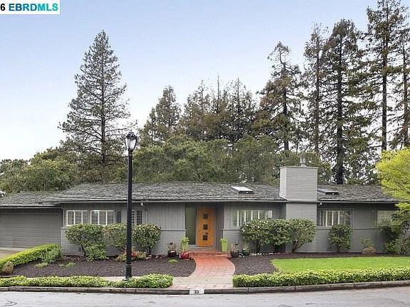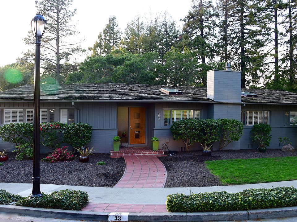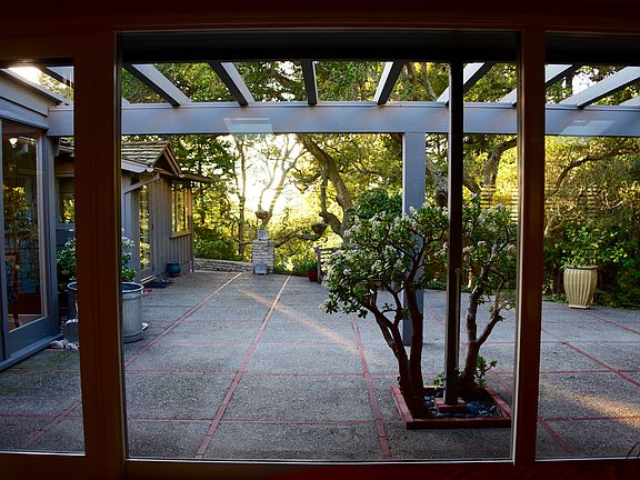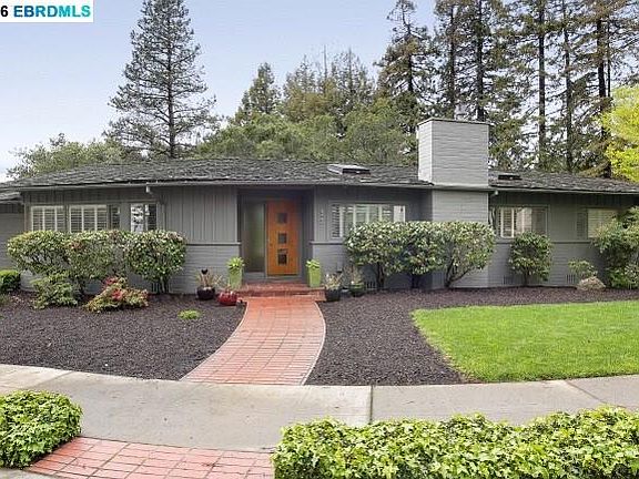 Classic Mid-Century style in prime location and serene setting. Mostly one-level living-great room with vaulted, natural wood ceilings; updated kitchen/family room; master suite with stunning bath. Home wraps around and opens to expansive, secluded patio overlooking oaks and redwoods.