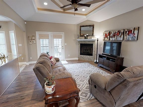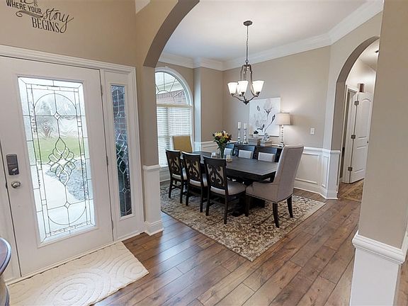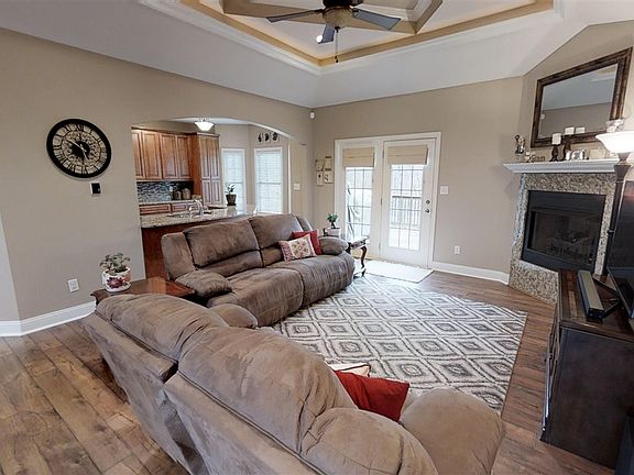 Be dazzled as you come see this STUNNING custom built, all brick ranch home! Walk into this lavish space with an open floor plan and tons of natural light. Arches, vaulted triple-tray ceilings, beautiful flooring, fresh paint, light fixtures, intercom system, and granite counter tops throughout the home, including the fireplace! The stunning kitchen, complete with custom cabinetry, glass tile backsplash, breakfast area, huge pantry, and stainless appliances is perfect. Formal dining area is decorated with gorgeous wainscoting. Huge master suite is perfect with double vanities, and separate tub and shower. You will love the grand, master designer, walk-in closet system, complete with built in shoe rack! Two more large bedrooms and full bath finish the main level. Downstairs you have a finished walk-out basement complete with huge family room, work-out room, full bath, extra bedroom, tons of storage, and a storm cellar. Enjoy movie night with a large theater room with a wet bar for entertaining. Enjoy the private wooded lot, landscaped with fruit trees, in a fantastic subdivision. This home is perfectly located and will not last long! Schedule your showing today!