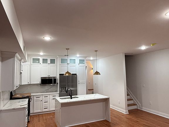 -Gourmet kitchen featuring a sleek waterfall island and Quartz countertop and backsplash, stainless steel appliances perfect for cooking and entertaining