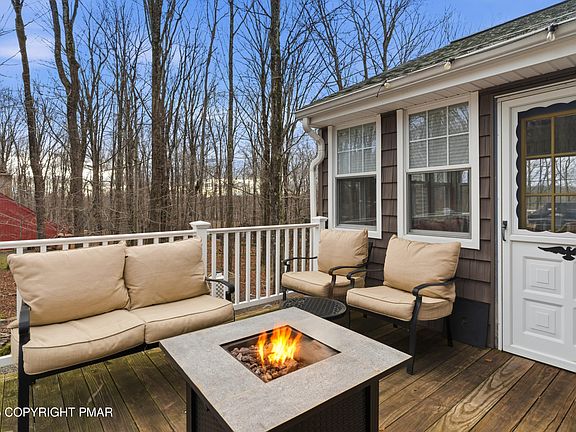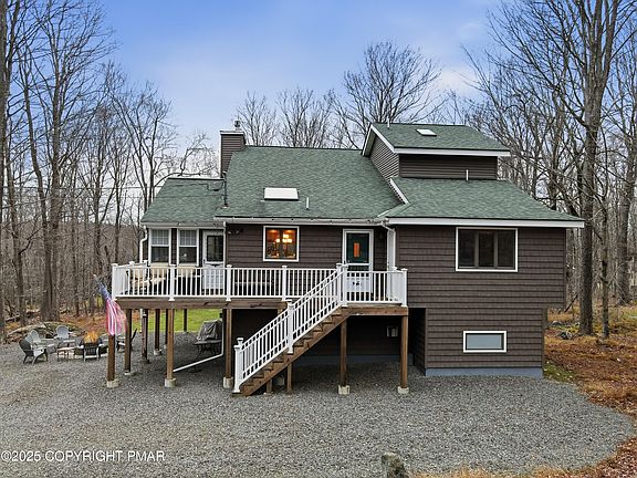Take Pocono living to the fullest with this stunning 4-bedroom, 3-bath contemporary home located just one street away from Big Bass Lake. Inside, you'll find a bright open-concept layout with soaring ceilings and abundant natural light. Discover the living room anchored by a cozy gas fireplace, framed by bay windows that offer peek through views of the lake. The fully finished basement is the ultimate space for entertaining, perfect for game nights, movie marathons, or hosting friends and family. A cozy sunroom offers year-round relaxation, while two spacious decks provide the ideal setting for outdoor dining or lounging. Gather around the fire pit under the stars and experience the true Pocono lifestyle. This home offers plenty of space for family, guests, or vacation rental guests. Big Bass Lake delivers exceptional amenities including two lakes, beaches, pools, tennis, and year-round activities all just minutes from Kalahari Resort, Camelback Mountain, and Mount Airy Casino. This is more than a home, it's a lifestyle. Schedule your private showing today!
