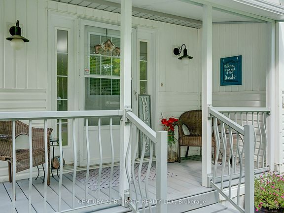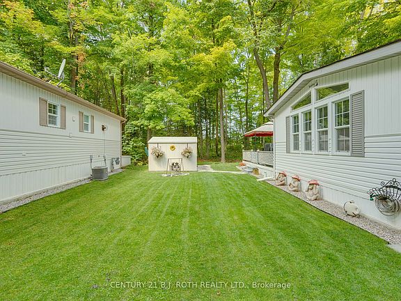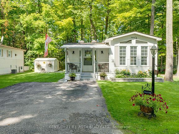 Welcome Home! Bright and cheerful Bungalow with a spacious open-concept living area in beautiful Wasaga Beach. Enjoy your morning coffee or entertain friends on the large back deck overlooking a peaceful forest setting. Den is complete with a smart folding door, providing privacy for your overnight guests. The welcoming and inviting front porch is complimented with attractive landscaping. Come and enjoy a social active lifestyle in a highly desired adult lifestyle community. With so much to offer, it's a perfect place to call home. Amenities include heated indoor pool, library, fitness room, billiards, main hall, and wood working shop. Activities and events include darts, horseshoes, shuffleboard, bocce ball, cards and games, fitness classes, BBQs, dances, and more! Monthly fees $704.16 (land-lease rent & property taxes). Pride of ownership is evident throughout. Recent updates include Furnace, Skylights, S/S Appliances, Washer/Dryer. Pack your bags and move right in!