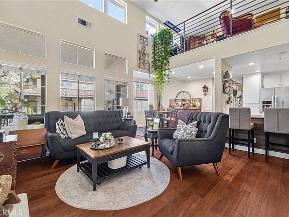 Prime location, corner unit located in the prestigious community of Melinda Heights in RSM. This beautiful home has numerous upgrades throughout. Open and spacious floorplan with an abundance of natural light with large windows, featuring 2 bedrooms, 2 bathrooms, plus an expanded upstairs large loft area, which does not reflect in the total square footage. The kitchen features stainless steel appliances and includes the refrigerator, recessed lighting, breakfast bar open to the living room and dining room. High ceilings in the living room with a custom ceiling fan and fireplace. Laminate wood flooring throughout and upgraded tile flooring in both bedrooms. Primary bedroom features vaulted ceilings, recessed lighting, custom paint and custom built in closet organizers and drawers. The bathrooms have been upgraded with beautiful custom cabinetry, counter tops and custom mirrors. The primary bath features high end finishes, dual vanities, a walk in shower with a sitting bench, Hansgrohe rain shower fixtures and an upgraded glass shower door. Off the dining room is the wrap around over-sized balcony with beautiful views, perfect for relaxing or entertaining. Direct access 2 car garage with ample storage and laundry area, washer and dryer are included. The community amenities include resort style swimming pool/spa, Beach Club, sport courts, BBQ’s and play area. Easy access to 241 Toll Road, Blue-Ribbon Melinda Heights Elementary School, Altisma Park and an abundance of shopping, dining and entertainment.
