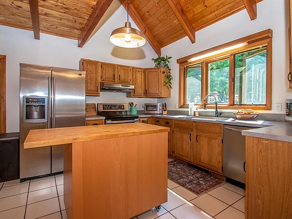Updated and airy 3+ bedroom cape on over two wooded acres with year-round views of Mt. Chocorua. Spacious mudroom entry and eat-in kitchen with center island, quartz composite sink and walk-in pantry. Soaring open concept great room with wood burning stove, tongue and groove ceilings and southerly windows for natural light throughout the day. Two bedrooms and full bath on first floor with second floor offering an open loft space and private master with renovated en suite including tiled walk-in shower and slate flooring. Walkout lower level offers amazing space with finished family room, huge laundry area, storage room and partially finished flex room featuring radiant heat powered by roof solar tubes. Additional office/in-law space over garage offers even more options. Access the wrap-around deck from the mudroom or great room and step down to the private backyard with fruit trees, swing set and fire pit. Neighborhood beaches on Pea Porridge Pond are only a half mile away or enjoy Madison resident beach rights to Silver Lake, all while being only ten minutes from town.