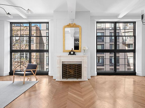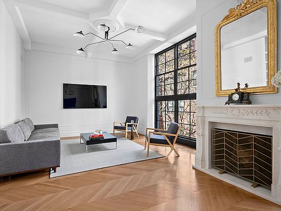$225,000 PRICE REDUCTION. Stunning, newly renovated and never lived in, this 3BD/3BA residence meticulously combines prewar details with modern enhancements – and at an amazingly low monthly maintenance. The oversized living room with Chevron French white oak flooring flows beautifully into a spacious dining room creating a 34’2” long great room. Dramatic new 11’ floor-to-ceilings windows frame the space which has 12’ ceilings. The rooms also feature an antique 19th century white marble decorative fireplace, originally from NYC’s famed Plaza Hotel, topped with a 19th century Louis-Phillipe gold-trimmed mirror. Adjacent is a bar with Zephyr wine fridge, seating for two and LED-lit library shelving for your collections.