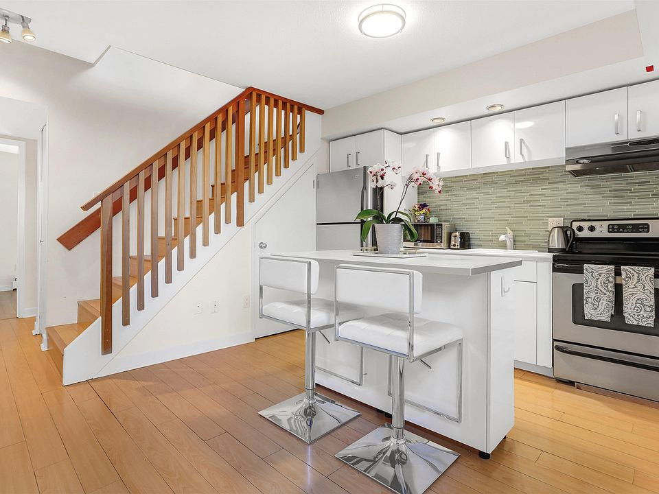 Centrally-located, one block to the Laurel Street overpass to Granville Island, Laurel Court is a well-maintained, unique-style condo building perched high on the corner of West 7th and Laurel in Fairview. This one bedroom, one bathroom, two level condo feels like a townhome with its private entrance and generous-sized, north-facing patio. Nicely updated, this home offers in-suite laundry plus shared laundry in building; storage locker and one parking. The kitchen, bedroom and bathroom are on the entry level. Upstairs is a sun-filled living room with balcony overlooking the tree-lined courtyard with peak-a-boo views to the City and Mountains. An ideal starter home in a walkable location, close to public transit/skytrain. Rentals and pets - one cat or dog - welcome.