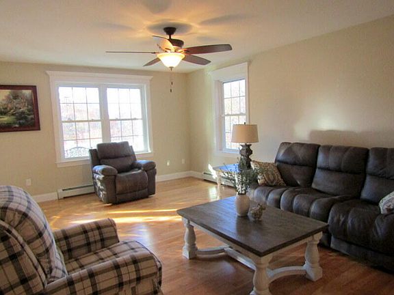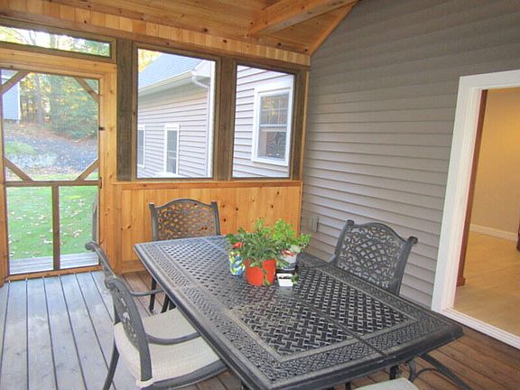 Wow, this home has it all and is located at the cul de sac on a private wooded 1.77 acre lot with just enough lawn to mow for recreation. The inviting open front porch is perfect to relax on after a busy day or you can enjoy the quiet serenity and outdoors on the very private 3 season enclosed sunroom that overlooks the backyard. Inside we have a tiled half bath with laundry and under cabinet lighting adjacent to the custom-made tiled kitchen with lots of walnut cabinetry, a wine cabinet, a corner hutch, a nice island with stools, lots of pretty lighting, granite countertops and stainless steal appliances. Everything right at your fingertips, ready for the cook of the house. The kitchen leads to the dining area and spacious livingroom and as you circle back there's a nice office,/computer room and the entrance to the insulated finished 2 car garage that has running water for your outdoor cleanup needs and a work bench. All the rooms in this home, except the bathrooms & kitchen, have beautifull Birch wood flooring ( 2023). Upstairs, to the right, we have 2 nice bedrooms, a full tiled bathroom, and a large all purpose room with skylights, closets and lots of space for whatever you want to do with this room ( could be a spare bedroom, playroom, hobby room, etc.). To the left of the stairway, we have a nice private primary bedroom suite with a separate tub & shower bathroom and Bertch Cabinets, a large bedroom w/lots of windows and a big walk in closet. As if this is not enough, we have a finished family room in the basement with a wood stove to help with the heating and large sliders to the side yard. There's also an utility room with on demand hot water, a propane boiler, and a large storage room w/shelving. Outside, there's a big shed for your outdoor tools and lots of land to play on. If you come see this home, you will WANT it, so come on, call me as it won't last long. SELLER CONCESSIONs AVAILABLE.