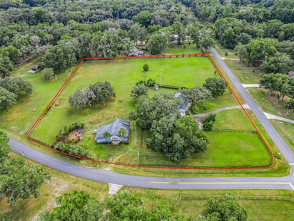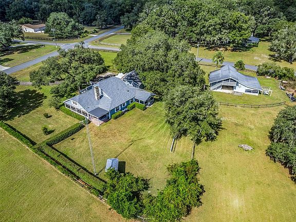 One owner gentleman's farm in the heart of Northwest Ocala horse country within minutes to the World Equestrian Center. On 4.6 fenced and cross fenced acres dappled with mature oaks, this thoughtfully designed property offers all the right amenities. The main home boasts two stories plus a basement for over 4,700 square feet of living space. The concrete block 14' center aisle barn features five stalls plus tack room with full bath and laundry and a rear shed row for storage plus a gardeners room. Above the barn is a one bedroom, one bathroom apartment complete with full kitchen. The stately main home features an offset two car garage with full second floor storage and wrap-around screened front porch with yellow pine wood ceiling and newer hot tub. Inside, you will appreciate the quality finishes throughout including hardwood floors, oversized wood burning stone flanked fireplace and pecky cypress accent walls. The kitchen, open to an oversized dining space, features an accent wall built of brick from old Dunnellon roads surrounding the cooktop and built-in double ovens. Adjacent is the formal dining which opens to a serene courtyard through French doors. The second floor offers a dedicated owners suite with adjacent library featuring cedar and cypress wood built-ins. The spacious owners suite offers breathtaking views of the property and an ensuite bath complete with dual sink vanity, walk-in shower, garden tub, water closet niche with bidet and walk-in closet with adjacent sauna room. The main level offers two additional bedrooms with an adjacent full bathroom. The basement, doubling as a safe room, has endless possibilities. Currently, there is an oversized office, full bath, numerous closets/storage rooms and plenty of space for a family room, game room and plumbing in place for a wet bar or kitchenette. Additional upgrades and updates include: central vacuum system, irrigation system around house and at garden, new well pump 2020, new drain field 2015, new roof on home and garage 2020, new ACs 2018 and 2021, newer double pane windows 2005, 3 board fencing along street and cross fencing with top board and no climb wire totaling four paddocks, electric to street for gated entryway and/or lighted columns and so much more. Virtual showings, video tour and 3D tour available! Don't miss out on this opportunity!