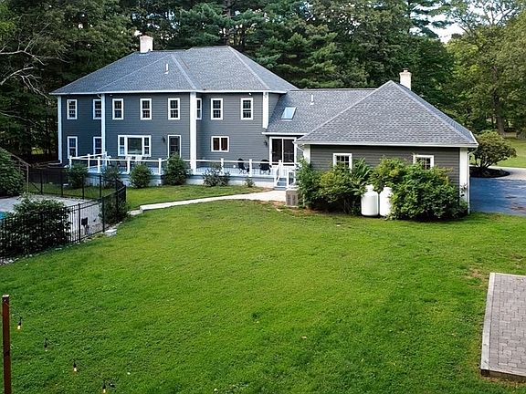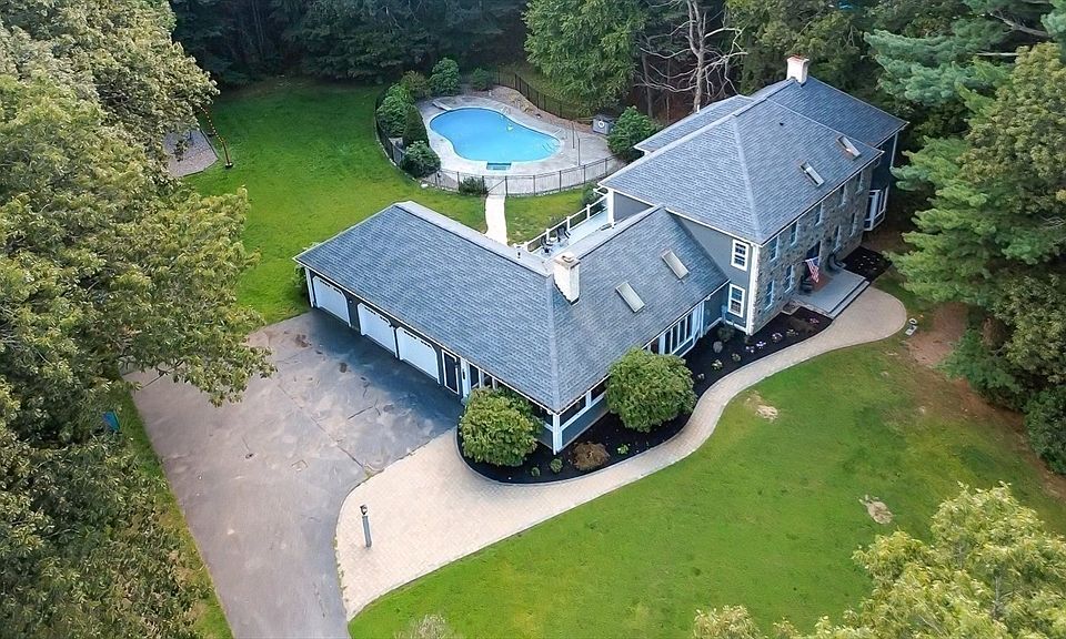 Welcome to Woodstone Estates! This desireable 10 room stone faced colonial features fully applianced kitchen with island, granite countertops & open concept adjacent great room with stone fireplace & gas insert/ sliders to deck overlook inground heated salt water pool/formal dining room/sunken front to back living room with French doors & fireplace/den with 3rd fireplace/2 half baths and laundry room complete the 1st floor/2nd floor consists of 5 bedrooms (one presently used as an office) En suite main bedroom with multiple closets/main bath has vaulted ceiling & oversized whirlpool tub & shower/double sinks and vanity / 2nd full bath at this level/3 car garage one of which is heated and used as a workshop/"get away" shed with mini split and electric connections for tv/level yard ideal for summer volleyball!/lighted firepit area/many upgrades most of which within in the last 6 years.