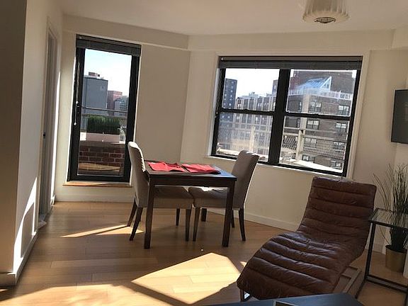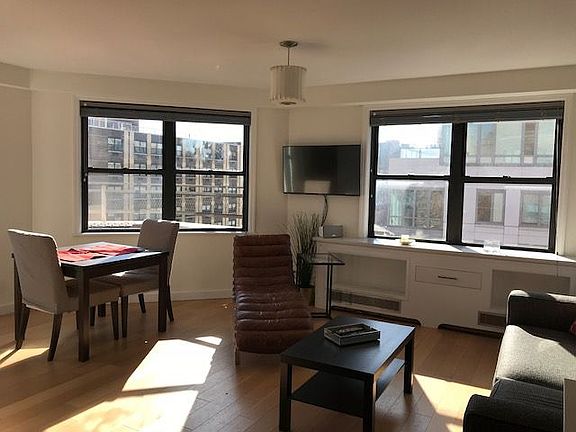 Southeast corner unit with 200 square foot private wraparound terrace. Completely renovated in 2014 with high-end finishes. Open kitchen with Bosch appliances (including dishwasher) and Caesarstone countertops. Honed marble bathroom with heated floor. Bedroom features large East-facing window and two closets. Flexible move-in date (board approval required) for one year term. Available furnished or unfurnished.