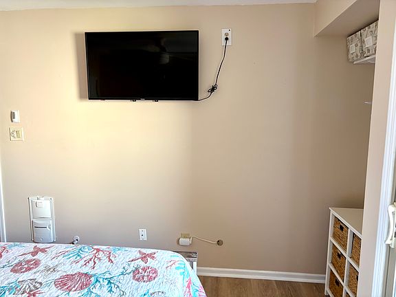 Bedroom one has a queen bed, TV and a small balcony. Closet has great storage and shelving system installed.