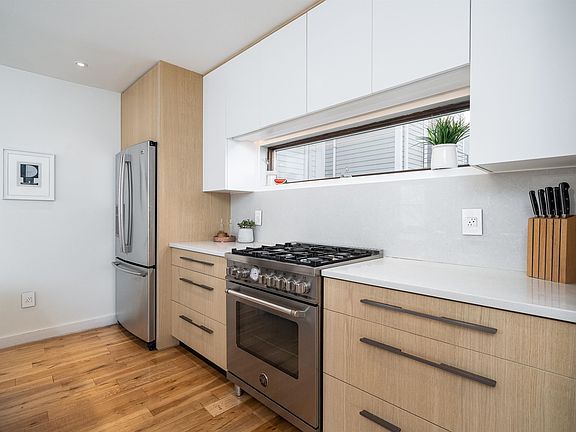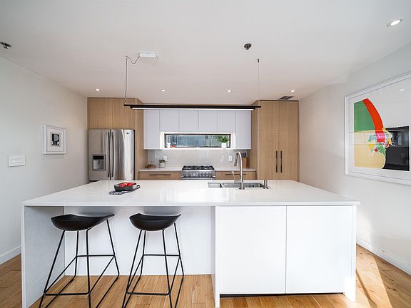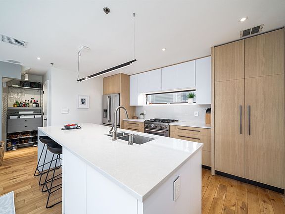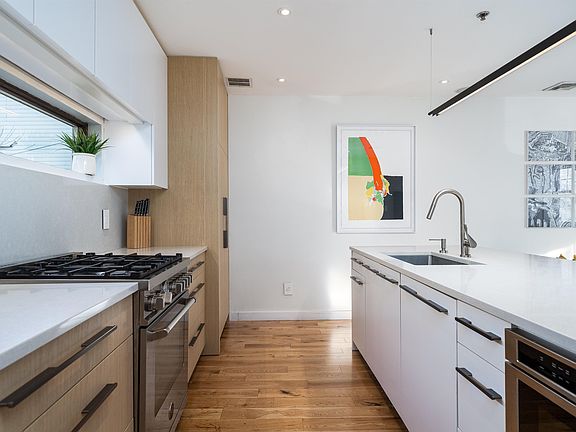 Behold high-end design within the most serene home setting. 330 4th St #2B is like no other. Nestled behind a wall of tall, green hedges, this 4 unit condo building consists of 3 units in the originally existing building and Unit 2B - a unique 4th unit built in 2006. The home is a private 2 floor duplex with deeded garage and 2nd parking space. Unit 2B exists without any shared walls -- creating a private and light filled sanctuary in the heart of Downtown Jersey City. Enter the main living area with open sight lines to the sleek japandi-stlye kitchen - adorned with two-toned custom cabinetry, gorgeous white quartz countertops, gleaming 5 burner Bertazzoni range, hidden dishwasher, deep stainless double sink with food disposal, and perfect task lighting to make cooking and entertaining a dream. Full floor-to-ceiling panty doors slide out for amazing storage, and extra deep cabinets provide a home for every appliance imaginable. The south facing windows on both the first level and bedroom level bathe the interior of this home in sunlight, and because the home is on a corner lot, sunlight is unobstructed from dawn to dusk. To the left of the main level’s open floor plan is a well designed mud room area and a half bath - also fully renovated - with Procelana vanity and tile work in muted gray tones. Wide-planked, blond, wood flooring ties all of the rooms together seamlessly, and leads you up 1 flight to the full second level. Upstairs, you will find 2 bedrooms and an additional 2 full bathrooms. Take note of the custom closet in the secondary bedroom and the upstairs hall closet - with full sized washer and dryer. Finally, head into the primary bedroom, and behold the ultimate show stopper of the home. Cathedral-height ceiling, beautiful custom wood-paneled walls in rich deep green, and custom lighting defining every space. Sconce lighting bedside, and the use of recessed lighting along the perimeter of the south facing wall creates a "cove lighting" effect, highlighting the ceiling's design and adding depth to the room. Another custom closet and designer ensuite bathroom finish this dream. And do not forget about the final “wow factor” right outside of the front door. Deeded parking for 2 - including extra storage in an oversized garage. There’s also a quaint shared outdoor space hidden behind the lush hedge, and it’s been newly renovated with stone pavers and additional plantings. And this unit has deeded roof right to the flat roof above the home... outdoor space or an additional level maybe? The possibilities are yours to explore. Take a tour today, and prepare yourself to immediately feel like you're home.