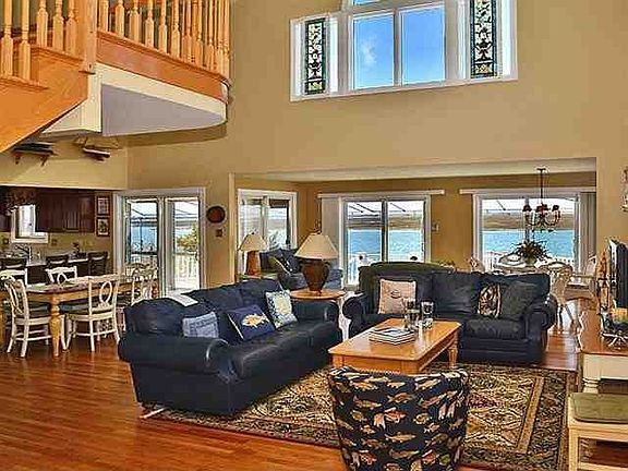 This bay front home offers a unique as well as traditional layout.Close proximity to beach while situated on the Bay. First floor; kitchen, family room with extended seating area with spectacular views of the waterfront, including 3 bedrooms and 2 bathrooms. Second floor offers a master suite and junior master suite. Entertainment room with wet bar which enters to 2nd floor decking; which offers fabulous Sunset Views.