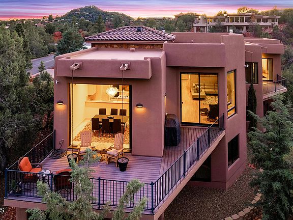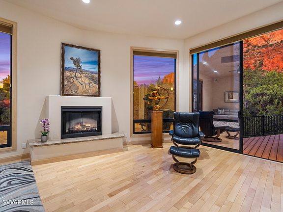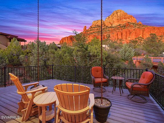 Prestigious Mystic Hills home with dramatic Red Rock Views of Elephant Rock. Close to numerous trails. Three bedrooms plus office all on one level. Featuring beautiful Maple hardwood flooring and doors throughout giving a European contemporary feel. Luxury master suite with slipper tub and oversized steam shower w/multiple heads. Kitchen features beautiful granite counters, custom maple cabinetry with ample pull out storage, double ovens and gas cooking. Two dishwashers. Stackable dining room door to bring the outside in. Three separate decks to sit back and relax while enjoying those famous views! Sellers are licensed AZ realtors. Minimum rental 6 months allows for intimate neighborhood feel. Wonderful neighborhood amenities including pool, clubhouse, tennis, pickle ball. Social events. Handicap features include two roll in showers plus main living one level. An additional 2600+ sq. ft. downstairs with windows, electrical and some concrete already installed. Prepared for your inspiration on additional sq. ft. Design as you wish. Planned location for an elevator. Schedule a private viewing today!
