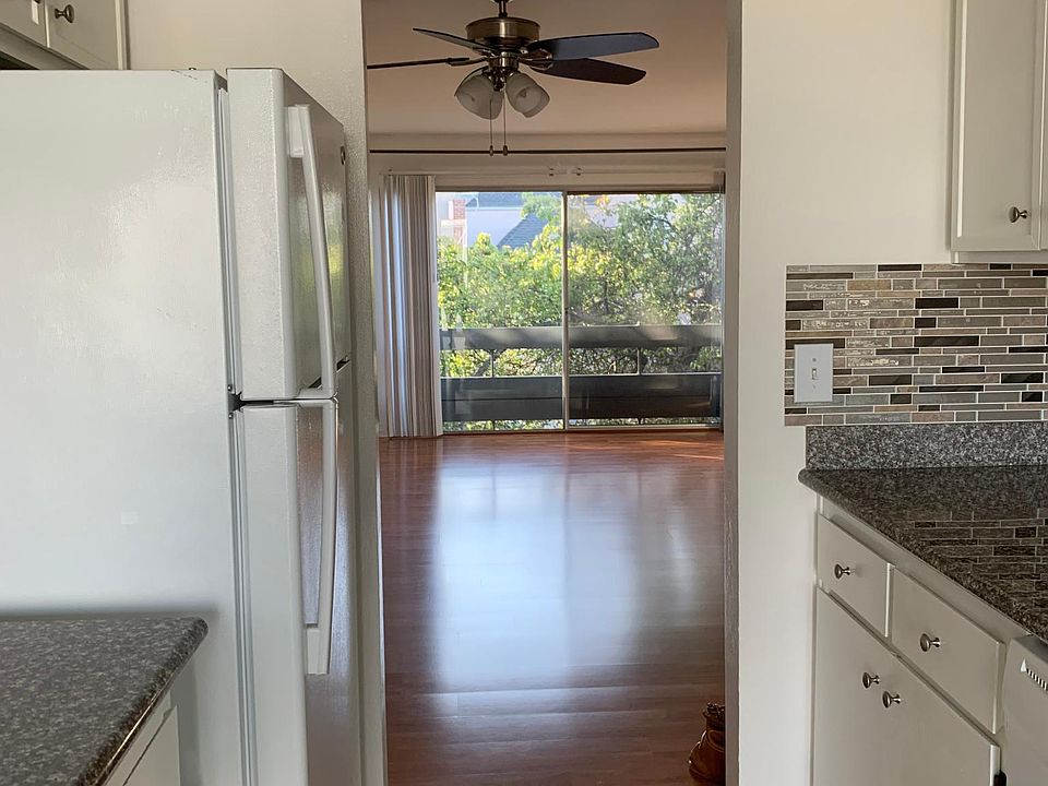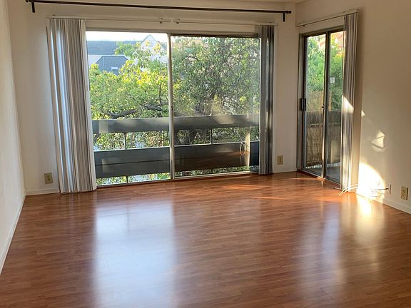 Need a bigger place to work from home? Huge top floor corner unit, with large balcony and windows. Great building, close to everything. Sunny and quiet 1 bedroom/1bath, totally remodeled with laminate flooring, large combination living and dining (or office), eat-in kitchen with new appliances and pantry, glass tile backsplash and granite countertops, two hallways closets and huge wall-to-wall closet in bedroom. Linen closet and separate sink/shower area in bathroom. Washer and dryer on each floor. Gated parking available. One year lease. One reserved parking space in gated garage available for $90/month. Cats are ok for additional fee. Owner pays for water, trash, landscaping and recycling and composting.