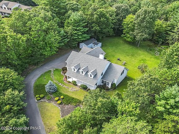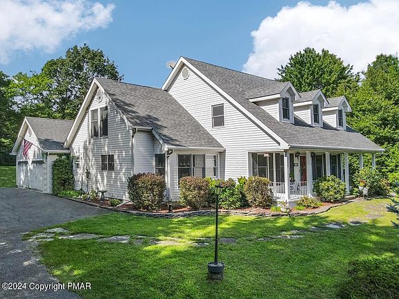 Discover the epitome of serene living in this stunning 5-bedroom, 3-bath estate, nestled atop your own private 7-acre oasis in the heart of the Poconos. This exceptional property offers a harmonious blend of luxury, comfort, and tranquility, making it the ultimate retreat from the hustle and bustle of daily life. As you arrive, a private driveway leads you to the unveiling of this hidden gem, complete with a spacious 2-car garage that provides ample storage for vehicles, outdoor gear, and more. The estate's expansive flat yard is a rare find in the Poconos, offering endless possibilities for outdoor activities, from family gatherings to gardening, or even the addition of a pool or outdoor entertainment area. The surrounding woods provide a natural playground for exploration or hiking. Imagine evenings spent under the stars, free from any outside light interference, where you can genuinely appreciate the beauty of the night sky and the vivid colors of the fall foliage during the day. Step inside to discover a home that has been meticulously upgraded, with attention to detail evident in every corner. The chef's kitchen is a culinary masterpiece, designed to inspire your inner gourmet. Featuring a gleaming granite island, this kitchen is the heart of the home, where you can entertain while preparing meals on top-of-the-line commercial-grade appliances. Custom cabinetry, premium finishes, and ample counter space make this kitchen as functional as it is beautiful, perfect for everything from casual family breakfasts to elaborate dinner parties. The open floorplan seamlessly connects the kitchen to the living and dining areas, creating a space that is both inviting and versatile. The family room is a showstopper, with its soaring vaulted ceiling and a dramatic floor-to-ceiling wood-burning fireplace that becomes the focal point of the room. Whether you're hosting a large gathering or enjoying a quiet night in, this space offers warmth and ambiance, enhanced by the natural light that floods in through the two sets of French doors leading to the rear patio. This seamless indoor-outdoor flow makes entertaining a breeze, allowing guests to easily move between the indoor living spaces and the expansive patio, where you can enjoy alfresco dining or simply relax with a glass of wine. The first-floor primary bedroom suite is a true retreat, offering privacy and convenience. Designed with relaxation in mind, this spacious bedroom features a large walk-in closet with custom shelving, providing ample storage for your wardrobe and accessories and includes the primary bath suite. This primary suite is ideal for those seeking single-level living, ensuring comfort and ease without sacrificing space or style. Upstairs, the home continues to impress with four additional generously sized bedrooms, each offering its own unique charm. These rooms provide flexibility for various uses, whether you need extra space for family members, a guest suite, or a dedicated home office. The upper level also features a well-appointed bathroom, ensuring that every family member and guest enjoys the utmost comfort. Despite its secluded setting, this estate offers unparalleled convenience, located just 5 minutes from all your shopping and dining needs. You'll have easy access to the area's largest hospital, St. Luke's Medical Center, ensuring peace of mind for you and your family. The Poconos is renowned for its recreational opportunities, and this home is perfectly positioned to take advantage of them all. Whether you're hitting the slopes at one of the nearby ski resorts, enjoying a day of fun at one of the three indoor water parks, trying your luck at the casino, or shopping at the outlet mall, everything is within an easy 15 minute drive. For those who appreciate culture and community, Downtown Stroudsburg is also just a 10 minute short drive away, offering a charming array of quaint shops, a vibrant farmers market, seasonal festivals, wineries, and a diverse selection of restaurants and pubs. Here, you can enjoy the best of both worldsprivate, peaceful living in a secluded estate, with the convenience of nearby amenities and entertainment options. This is more than just a home; it's a lifestyle. Don't miss the opportunity to make this extraordinary estate your own. Schedule your private showing today and experience the unmatched beauty, luxury, and convenience of living in the Poconos. Your dream home awaits!