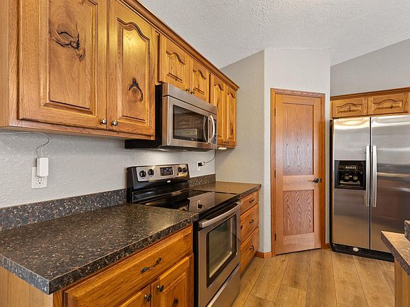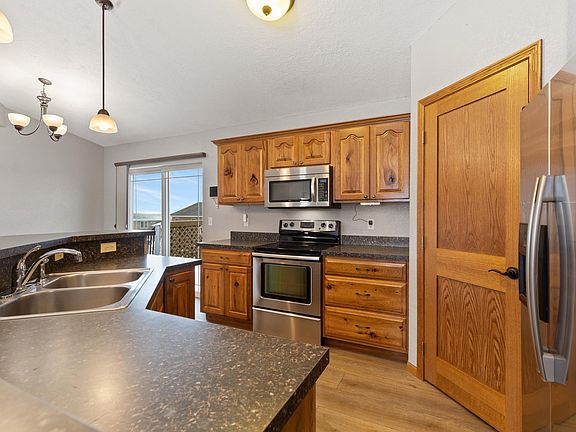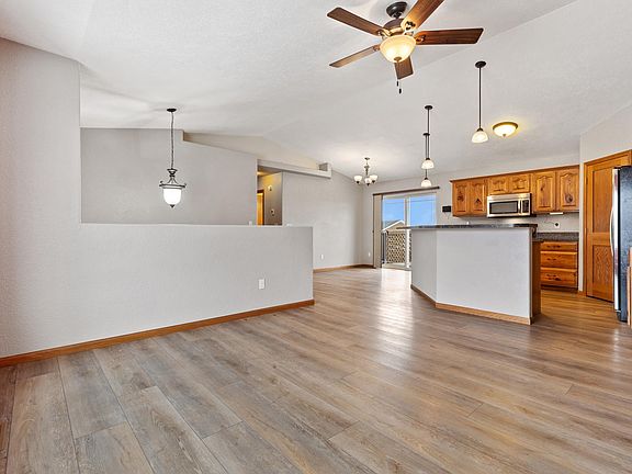 Welcome to this refreshed and move-in ready home located in an established neighborhood just South of Box Elder. The main level features an open floor plan with new LVT flooring and lots of windows. Great kitchen with large center island, corner pantry, new dishwasher and custom wood cabinets. Upgraded finishes include solid wood doors throughout. Both upstairs bedrooms offer walk-in closets and new carpet, one with custom shelving. Downstairs, you'll find a comfortable living room with new LVT flooring plus large 3rd bedroom, offering plenty of space and versatility. The mudroom/laundry room conveniently connects to the garage, and the deck off the dining area leads to a partially fenced backyard with fruit trees and room for a garden. New water heater in 2022, gas forced-air heat, central AC. Additional parking by garage for RV or trailers. Listed by Holly Glatt, Keller Williams Black Hills, 605-641-4425. Buyer & buyer's agent to verify MLS info and measurements