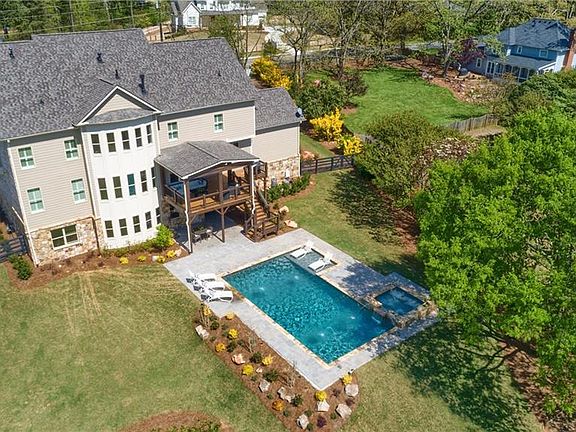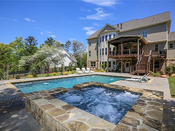 Better-than-new construction in Roswell. This home is located on a large, private lot with a location convenient to downtown Roswell, Milton, and GA-400. Enjoy the beautiful custom, heated, saltwater pool with sunshelf, spa, and paver patio just added this spring. This home has a great layout for families and is enhanced with top of the line designer finishes. You will be amazed by the large mudroom with built-in bench and cubbies, downstairs laundry including sink and cabinetry, and and incredible walk-in pantry with space for your large boxes and a second refrigerator. Enjoy the stunning kitchen with beautiful custom cabinets, quartz countertops, multiple workstations, huge island with storage, KitchenAid stainless appliances and refrigerator. Beautiful built-ins and ceiling treatments are located throughout the home. A wonderful, expandable sound system has been installed, providing music to the first floor and outdoor living space. There is a large guest bedroom with beautiful full bath on main. Relax on the covered deck overlooking pool and private, wooded lot. The upstairs master retreat is styled with a spa-like bathroom with marble finishes and a private entry to second laundry room. You will also find a large media room, ensuite bedroom, and two additional bedrooms that share a Jack-and-Jill bathroom. 3 1/2-inch plantation shutters have been installed in every bedroom, bathroom, and street-facing window. New professionally-installed landscaping and sod perfectly accents the older trees and plants that were left protected by the builder. Easy-to-finish basement is stubbed for a bathroom and will provide tons of additional living and storage space.