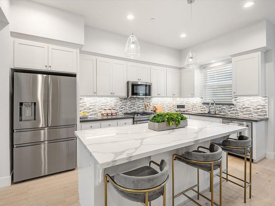 Not to be missed!! Desirable Palmero Crown Jewel Mt.View thome 5 years young with many upgrades + two Primary bedrooms + high ceilings. Palmero unique DX plan with first flr full ba Primary bdrm. 4/3.5 1,898 sq. ft. 2nd flr Kitchen upgr to higher tier Quartz counters with added custom artistic bsplash, upgr Jenn-air stainless steel appl, & added pendant lighting. Dining w/ new accent wall, lg livrm, + balcony. First flr 2nd primary bdrm's bath upgraded quartz ctop, tiled flr and shower to higher tier + closet shelving added. Upgr pre-engineered wider plank Hdwd flrs & upgr luxury carpet. Top flr with Primary bdrm + two other bdrms. Primary bdrm w/ new accent wall, upgr closet w/ built-in custom shelving/drawers, & added 4 recessed c lights. Primary bdrm bath shower tile and ctop upgr to higher tier. Hall bath upgr flr and shower tile, & ctop to higher tier. Bdrm/office upgr w/ 4 recessed ceiling lights, & added in-wall TV wiring and power outlets. Upgr levolor roman blinds window coverings. 2 car garage upgr by adding cabinetry, recessed shoe rack, & epoxied flr. Easy access to Dtown Mt. View Castro St, Los Altos, Tech Giants, 85, 101, Costco. Great schools: Theuerkauf, Crittenden, Los Altos.