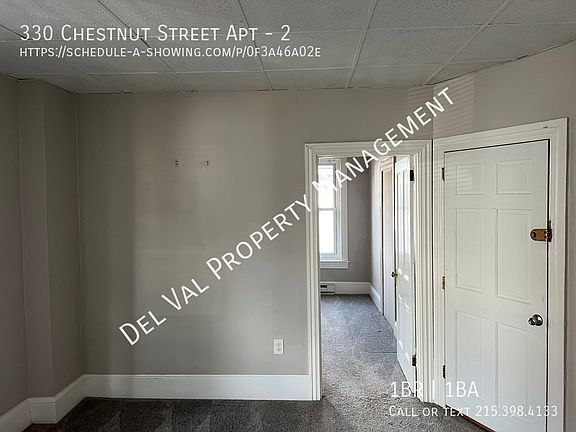 Spacious & Well-Maintained 1-Bedroom Apartment in Pottstown Available Now! 330 Chestnut Street, #2, Pottstown, PA $895/month Includes Water, Sewer & Trash! Step into comfortable, private living with this large 1-bedroom, 1-bathroom apartment, conveniently located in the heart of Pottstown! With a private entrance, brand-new carpeting, and a freshly painted interior, this charming unit is move-in ready! Apartment Features: 1st-Floor Convenience No stairs to climb! Private Entrance Enjoy your own secluded entryway Brand-New Carpet Fresh, cozy, and inviting Spacious Kitchen Plenty of cabinet and counter space (not eat-in) Walk-In, Sit-Down Shower Easy access & extra comfort Freshly Painted A clean, modern look throughout Secured Building Entry Added peace of mind Street Parking Available Prime Location Everything Within Reach! Less than a 15-minute walk to Montgomery County Community College West Campus Close to Schuylkill River, Memorial Park & Pottstown Riverfront Park Perfect for outdoor relaxation! Minutes from shopping & dining options Conveniently located near local favorites! No Pets | No Smoking Permitted Lease Details & Application Process One-year lease minimum (longer leases available if needed) Application Fee: $50 (non-refundable) + One-time Lease Administration Fee: $25 Move-in Requirement: First month's rent + Two (2) months' security deposit Schedule a Showing or Apply Today! Application Process: $50 non-refundable fee. Applicants must provide three months' rent to move in (first month + two months' security deposit). Income, credit, rental, and employment history will be verified. Resident Benefits Program Your lease includes our Resident Benefits Program offering perks such as: ZeroDeposit Program through Obligo (skip traditional security deposits for qualified residents, additional fees apply). Convenient Online Rent Payments. Concierge Utility Services. One-time Late Fee Forgiveness. And more! Other Del Val Properties Browse more homes at Homes For Rent. Property listed by: Del Val Realty & Property Management 49 E. Lancaster Avenue, Suite 300 Malvern, PA 19355 Philadelphia Property Management All information is deemed reliable but not guaranteed. Independent verification is recommended. Don't miss this opportunityschedule your showing today! #PropertiesFor Rent #RealEstate #HomeForRent #ApartmentForRent #ProperiesForLease #HouseRentals #Tenants #PropertyManagement #RentPrices #HouseForRent #Rentals #PhillyApartments #PhillyLiving #ApartmentRent #Explore #ExplorePage #DelValRealty #RowCal #RowCalNation