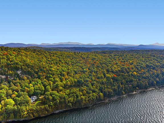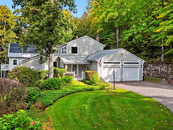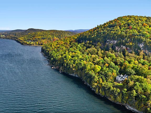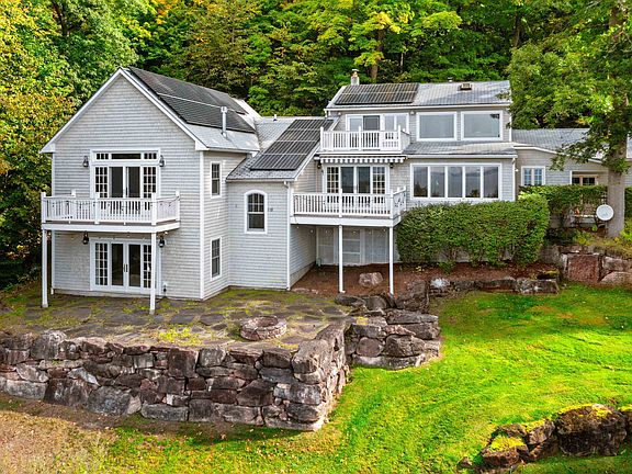 West facing 10 acres and 312 feet of private lakefront with wonderful clear water perfect for swimming and mooring your boat on a new Hazelett mooring. 35 minutes to downtown Burlington Vermont and you can live the dream on Lake Champlain. The 10 acres has lawns, rock gardens, patios, walking trails to Eagle Mountain Nature Preserve. The home has a great floor plan for everyone to enjoy. Cherry floors in the kitchen and living room lead to a study/den with big views to the lake. Off the kitchen is a dining area with a large deck for more westerly views and sunsets. The first floor spacious primary bedroom is perfect to add a seating area for a private retreat and another deck to the views! Enjoy a gas fireplace, built-ins and bathroom with dual sinks, soaking tub and water closet. Upstairs are two intimate bedrooms, full bath and a private deck. The lower level features a large family room with speakers, gas fireplace, built ins and small office area. The walk out lower level to patio takes you to the lakefront with stairs to a rock beach with large slabs of rocks to lay in the sun. A dock system is ready to install next season. Newly installed solar with battery storage takes care of your electric costs and hot water. Central Air conditioning in the addition with mini split air conditioning in the main house. Lawn and garden irrigation - what more do you need? These owners respected this home with terrific upgrades and enjoyed every minute living here. Video online!