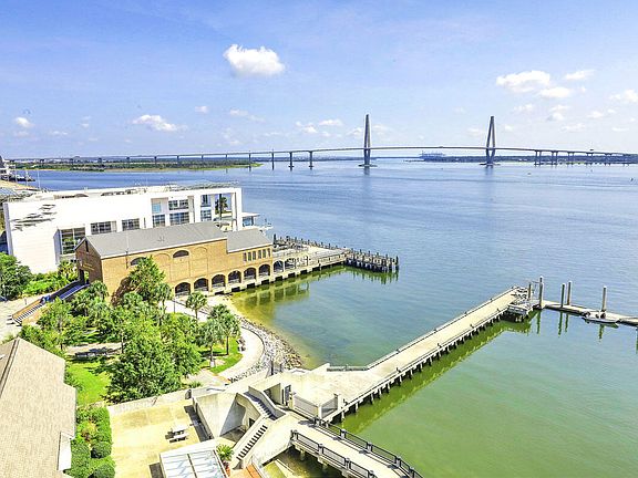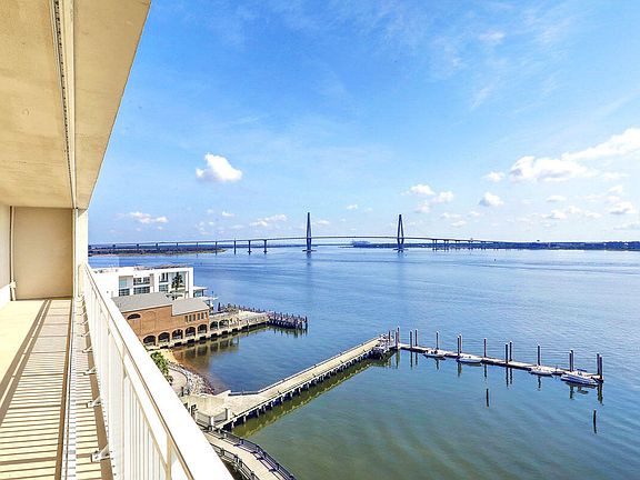 Experience million-dollar panoramic water views including Charleston Harbor, the Ravenel Bridge, the Cooper River, and the South Carolina Aquarium from 3 private balconies in this spacious 2 bedroom, 2.5 bath Dockside Condominium. Parquet floors, crown molding, arched doorways, and large living and entertaining rooms define the unit. On one end of the condo is a massive living room with corner views sweeping across the harbor. It includes a wet bar and half hall bath. A secondary bedroom with en suite bath shares the same floor-to-ceiling views. On the other side of the unit is a large dining room, den, and the primary suite, with walk-in closet and en suite bath. These rooms boast water views encompassing the Maritime Center as well as the rooftops and steeples of historic downtowEven the central kitchen has balcony access and views of the Yorktown and Patriots Point, marinas, and the Ravenel Bridge. It includes a huge butler's pantry/laundry room with a second freezer and sink. The unit provides tons of storage space in multiple closets and cabinets. Dockside is conveniently located in downtown Charleston near the Charleston Maritime Center and Fort Sumter boat tours. Amenities include 24-hour security, lobby, club room, library, heated pool and fitness center. Waterfront Walk takes you to a deepwater boat dock facility for residents.