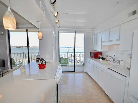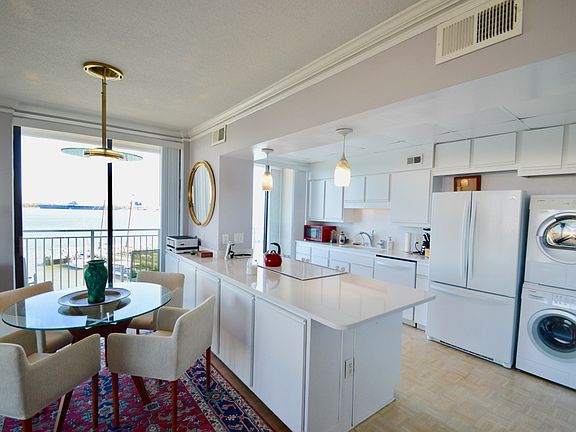 Must see waterfront condo at Dockside. This corner unit has an open floor plan with floor-to-ceiling windows with views of Charleston Harbor and full balconies on both sides. Hardwood floors, spacious rooms and open kitchen. Master suite has two closets, balcony access & an ensuite bathroom. Guest bedroom features balcony access & a large closet and a guest bathroom across the hall. This condo features a tankless water heater, water filtration system, security system and Bosch Washer and Dryer. Dockside has on site security and amenities including an indoor pool, recreation area, fitness center, sauna, a pier & floating dock. Dockside is waterfront gated community is walking distance to many restaurants, shops, the aquarium and much more! One reserved, garage parking space plus additional parking. Application fee is $50. No pets. Dockside Community