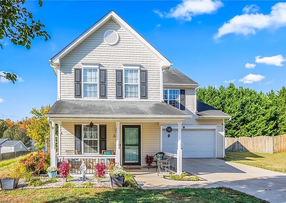Welcome to this charming 2-story home in Kernersville! With 4 bedrooms and 2.5 bathrooms, this inviting residence features a large front porch, perfect for relaxing on warm evenings. You’ll be greeted by a spacious open kitchen that boasts a generous butcher block island with ample storage. The kitchen is adorned with a stylish tile backsplash, stainless steel appliances, and a cozy coffee bar. Just across from the kitchen, discover a convenient drop zone with hidden storage under the stairs, keeping your entryway tidy. The living room, featuring vinyl plank flooring, flows seamlessly into the sunroom, creating a bright and airy space for family gatherings or quiet relaxation. All 4 bedrooms are located upstairs, including a spacious primary suite that offers a WIC. The primary ensuite showcases a luxurious garden tub with a stunning tile surround, as well a full separate shower. The remaining bedrooms share a full hall bath. HOME WARRANTY BEING OFFERED!