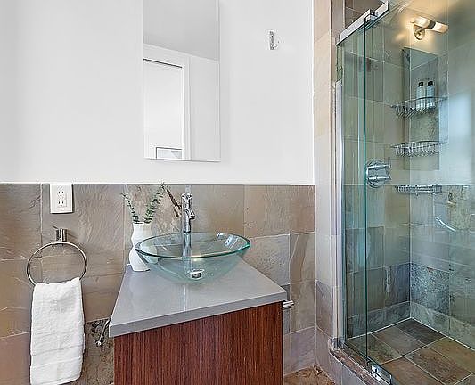 The bedrooms are thoughtfully set apart from the main living areas, creating a quiet and private retreat. The generous primary suite features tailored custom closets, built-ins, and a modern windowed en-suite bath. The south-facing second bedroom is bathed in natural light throughout the day and enjoys convenient access to the beautifully finished, marble-accented bathroom.