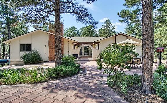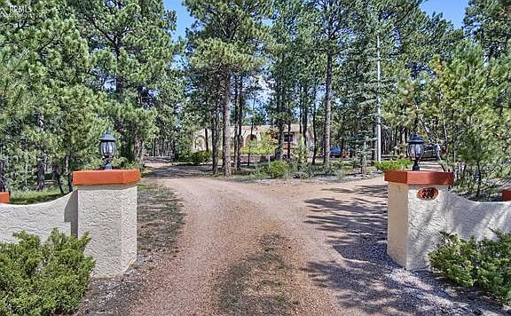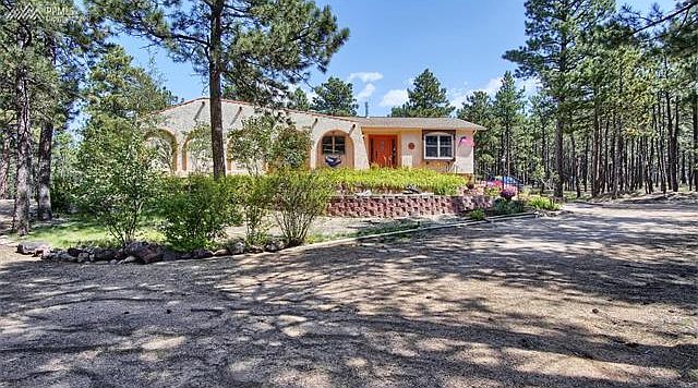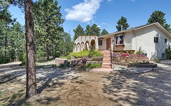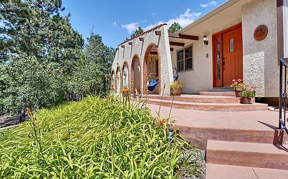 Custom Southwest design with a Mediterranean flair! Stucco monuments grace the entry of this lovely wooded home site. Enjoy Pikes Peak & mountain views from arched openings on the front porch. Formal dining/living rooms plus spacious hearth room open to updated kitchen w/ Rivera cabinetry, Silestone counters, stainless appliances, Moen faucet/Kohler sink. Main level owners retreat w/ custom walk in closet & private 5 pc bath featuring custom double vanity cabinetry, window seat, glass block shower, walk out to rear deck. Two walk out's to courtyard & large rear outdoor living area. Two wood burning brick fireplaces. Anderson wood replacement windows. Updated baths with custom tile showers and back splash. Lower level features wet bar, pool/game area, 2nd family room with fireplace, 2 bedrooms, sauna, laundry room and sound insulated flex/music/bonus room. One lower level bedroom has custom built in shelving and desk to double as home office or den. Circular driveway and Terra Cotta colored concrete patio. Whole house intercom with radio and CD player. Comfortable gas boiler heat system. Loads of storage/closet space. Covenants and well permit allow for 2 horses. Large lot with room to add a detached garage or small barn/corral.
