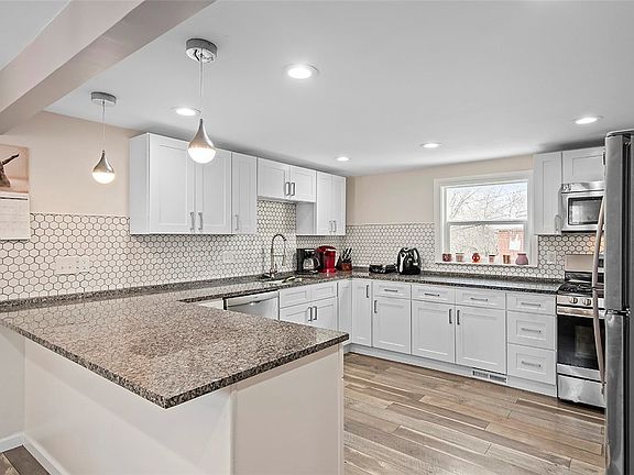 Located in a desirable community, this charming brick cape cod, completely remodeled home is on a quiet dead-end street. This home is so much larger than it looks and a cute front porch welcomes you and your guests! New wood look laminate floors and recessed lighting flow through the first floor. The spacious living room leads to a flex space set up as a desk space. The bright dining room opens to the newly appointed kitchen with new shaker cabinets, granite counters, tile backsplash and stainless appliances. A huge first floor primary bedroom with primary bath with a new tile shower. The second level has two bedrooms and another new full bath with a tile shower. The lower level boasts a finished game room with built in shelving. There is a large laundry area with a half bath. Appreciate the oversized garage and semi-flat back yard. There are too many updates to mention including new windows! This home is convenient to shopping in Bridgeville, I-79 and public transportation.